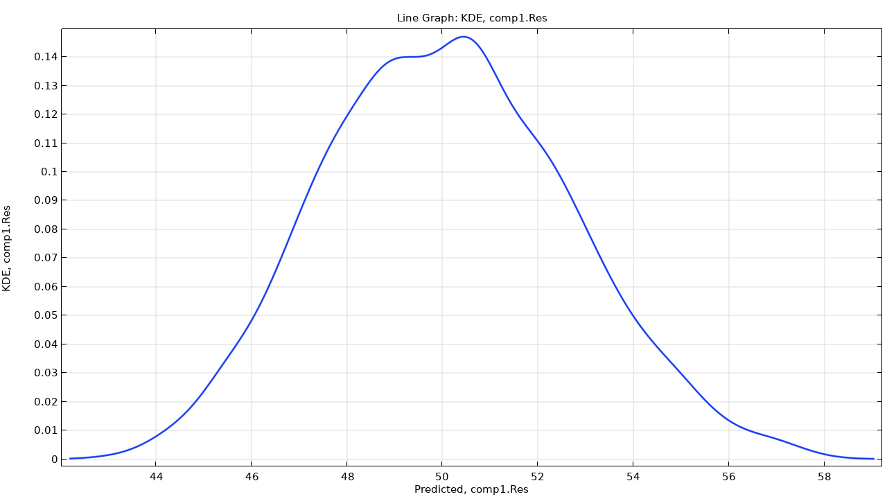 In the uncertainty propagation study, we sample the input parameter distributions and generate a kernel density estimation (KDE) plot (Figure 8). This plot displays the probability distribution of the resistance value. The result gives manufacturers a realistic view of how resistance might vary across production samples. The plot shows that the highest probability density occurs around a resistance value of 50. According to the QoI confidence interval table, the mean of the predicted resistance value is 50.099, and the standard deviation is 2.5821.