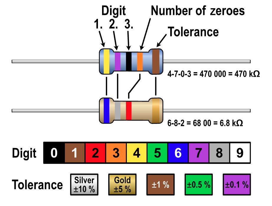 Figure 1. Resistor codes including the information of the resistances and tolerances. This file is made available under the Creative Commons CC0 1.0 Universal Public Domain Dedication via Wikimedia Commons.