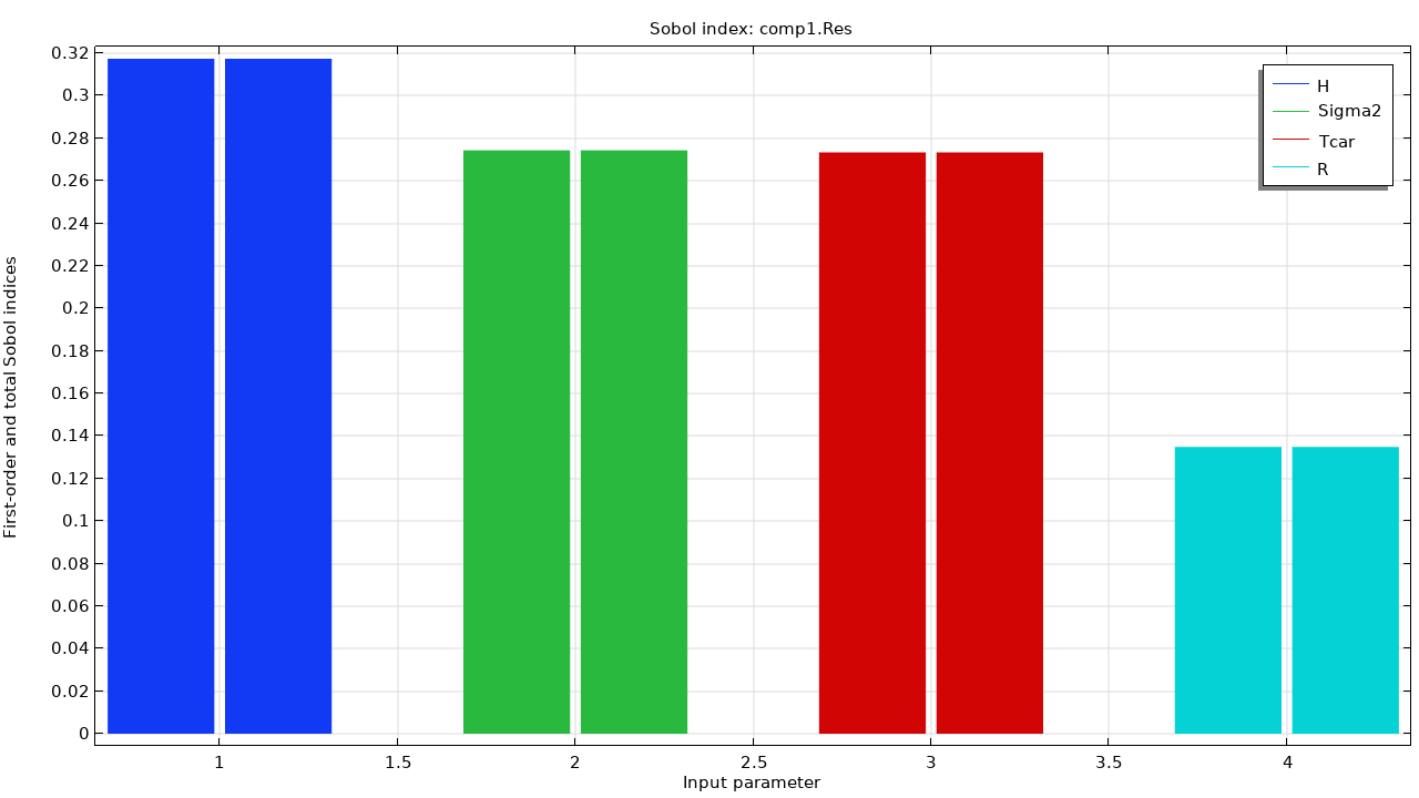 Next, we performed a sensitivity analysis using a sparse polynomial chaos expansion (PCE) surrogate model, which was automatically constructed to efficiently explore the input space. Figure 7 shows the Sobol indices, which quantify each parameter’s contribution to the resistance variance. The results indicate that height (H) is the most dominant factor, followed by conductivity (Sigma2) and etch width (Tcar).