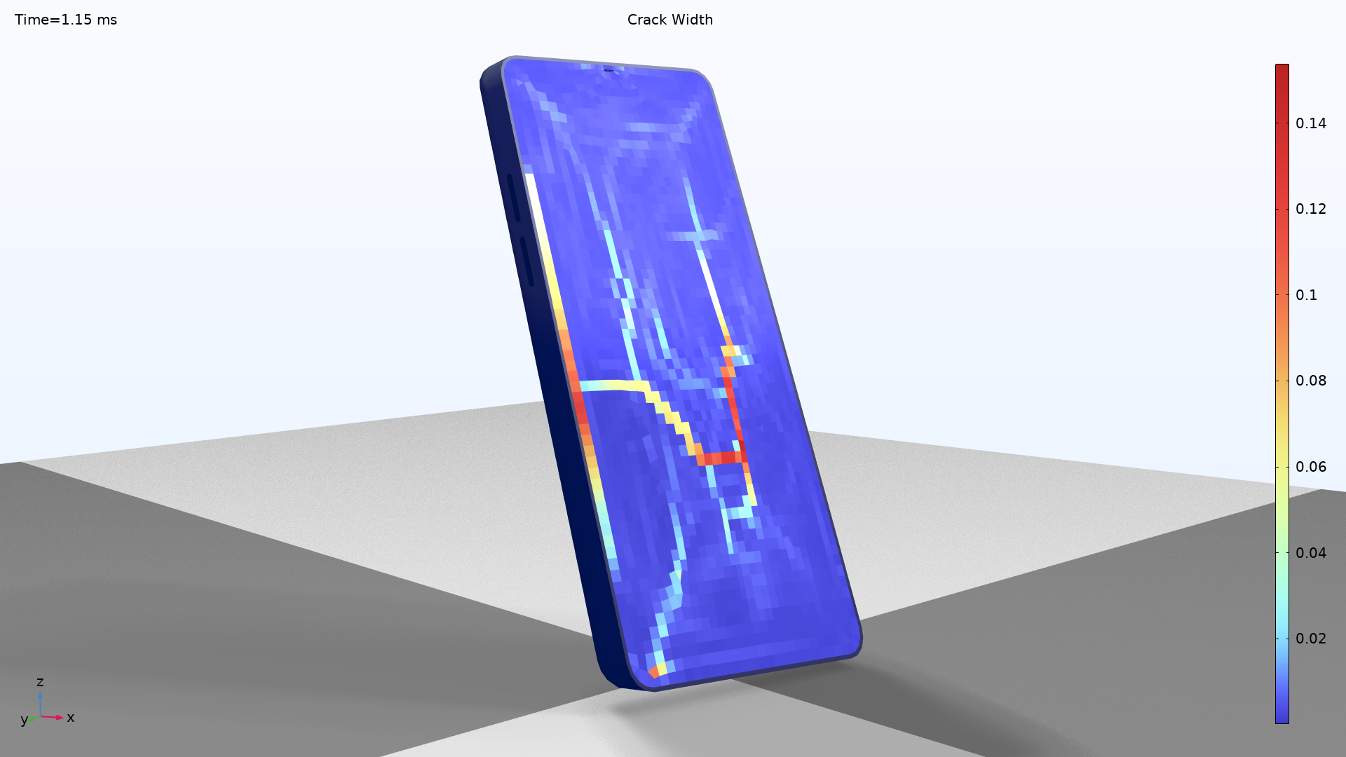 When not being held, our cellphones are rarely more than an arm’s reach away. With so much handling, dropping them is a common occurrence. According to a survey by Allstate, around 78 million Americans reported damaging their cellphones in 2023, with cracked screens accounting for 67% of that damage (Ref. 1). Your phone may be unscathed after some drops and shattered after others, so how do we know what conditions are most likely to cause damage? Version 6.4 of the COMSOL Multiphysics® software introduces new functionality for performing time-explicit structural dynamics analyses, including simulating a phone drop test.