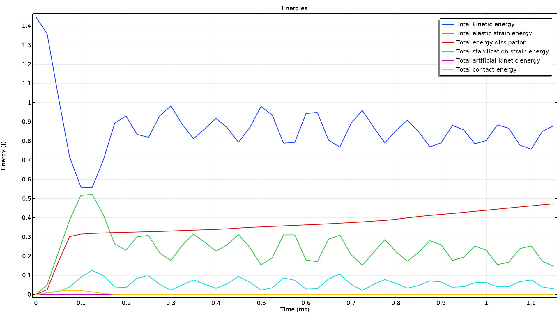 Users can also simulate the evolution in time of various energy quantities. The total kinetic energy quickly reduces at first due to the high acceleration during the impact with the ground. Some of this energy is dissipated as irrecoverable plastic deformation, while the rest is stored as elastic strain energy. Over time, the vibrations induced by the impact are witnessed in the graph through an exchange between kinetic and strain energy. The dissipated energy increases due to crack propagation and artificial viscosity.