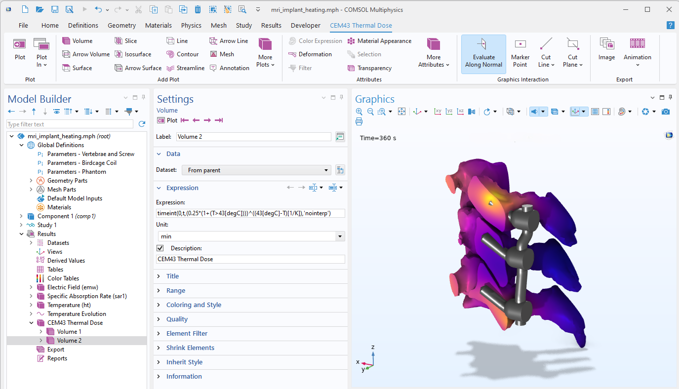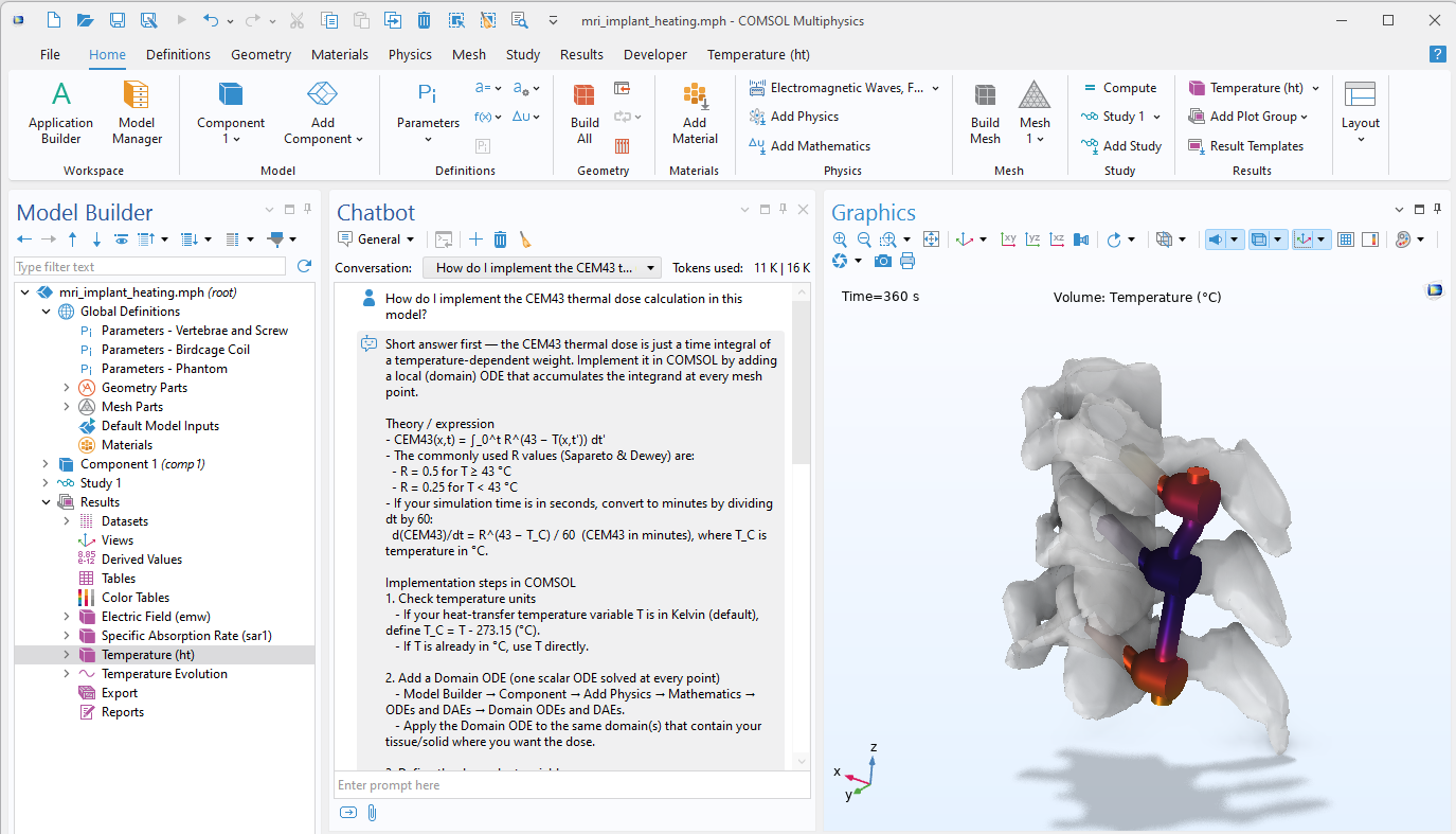 Once the temperature fields over time are known, you will want to evaluate thermal damage. This step is where you can use the CEM43 thermal dose calculation — and this is where I turned to AI for help. I inserted a well-crafted prompt for ChatGPT® into the Chatbot window in COMSOL Multiphysics®, and the results told me that the CEM43 is defined as the following time integral: