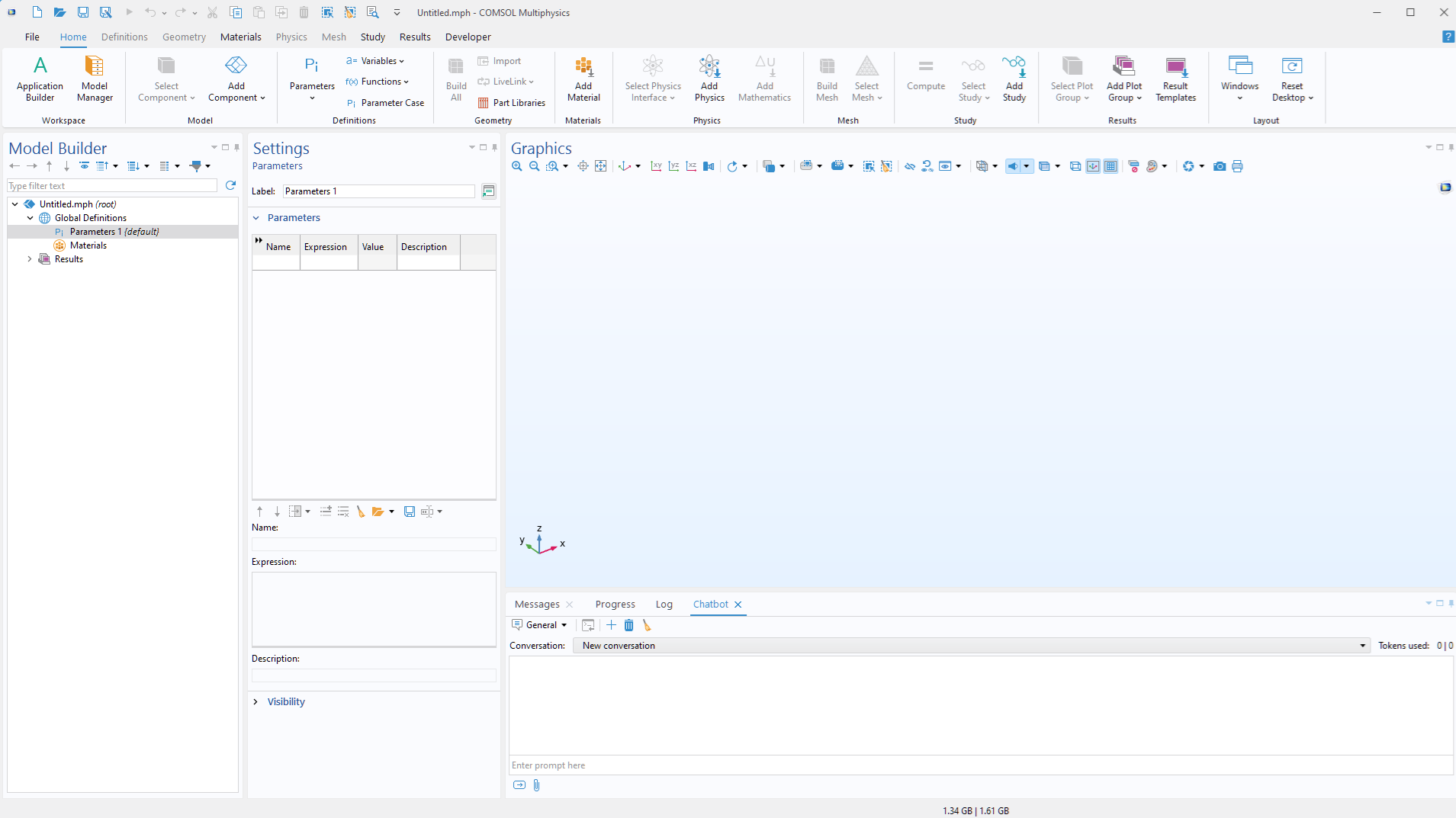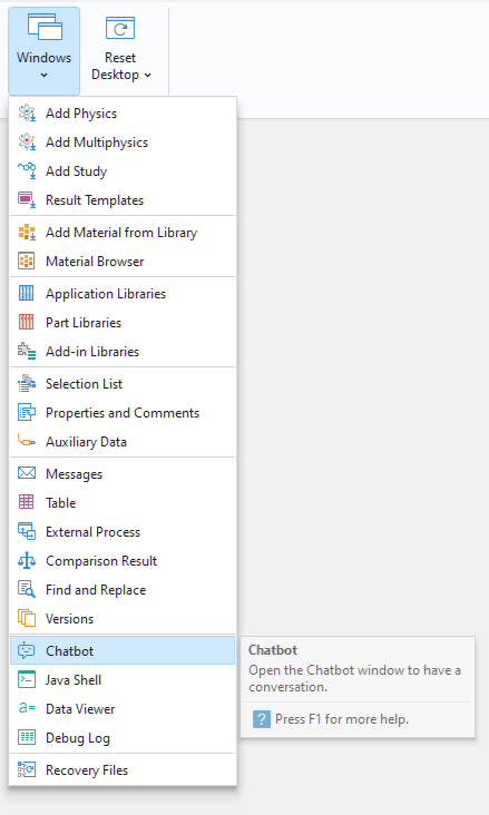 The Chatbot window is available for the Windows® version of COMSOL Multiphysics®. It is included in the platform product and, as of version 6.4, is installed by default, but without an active connection.
