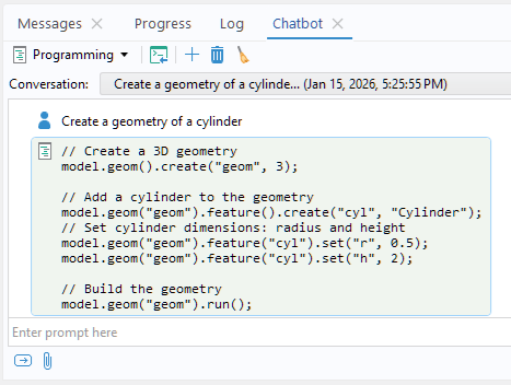 For this example, select Programming. This provides the chatbot with programming-focused context, prompting responses that include COMSOL API code.