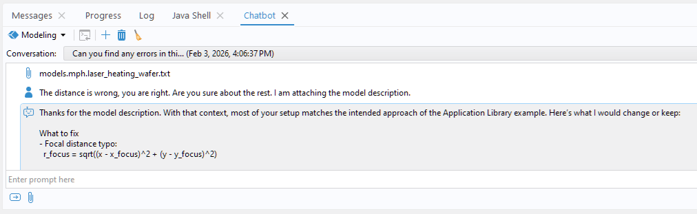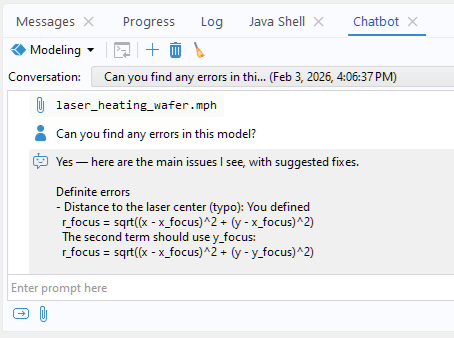 You can also use the Chatbot window to find simple mistakes in your modeling setup. While the chatbot functionality doesn’t understand all aspects of modeling and simulation, it can still be helpful; for example, it can identify typos in expressions used in the Model Builder.