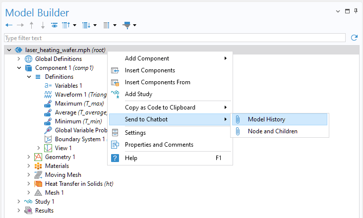 Right-click the root node, laser_heating_wafer.mph (root), in the Model Builder tree and select Send to Chatbot > Model History.
